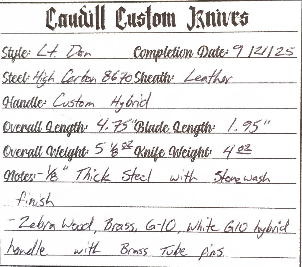 Introducing Lt. Dan #2—a sharp companion made from strong 8670 high carbon steel. Its eye-catching custom hybrid handle mixes zebra wood, brass, and white G10, all accented with brass pins for a stylish grip. Tough, unique, and ready for action, Lt. Dan #2 is as fun to hold as it is to use!